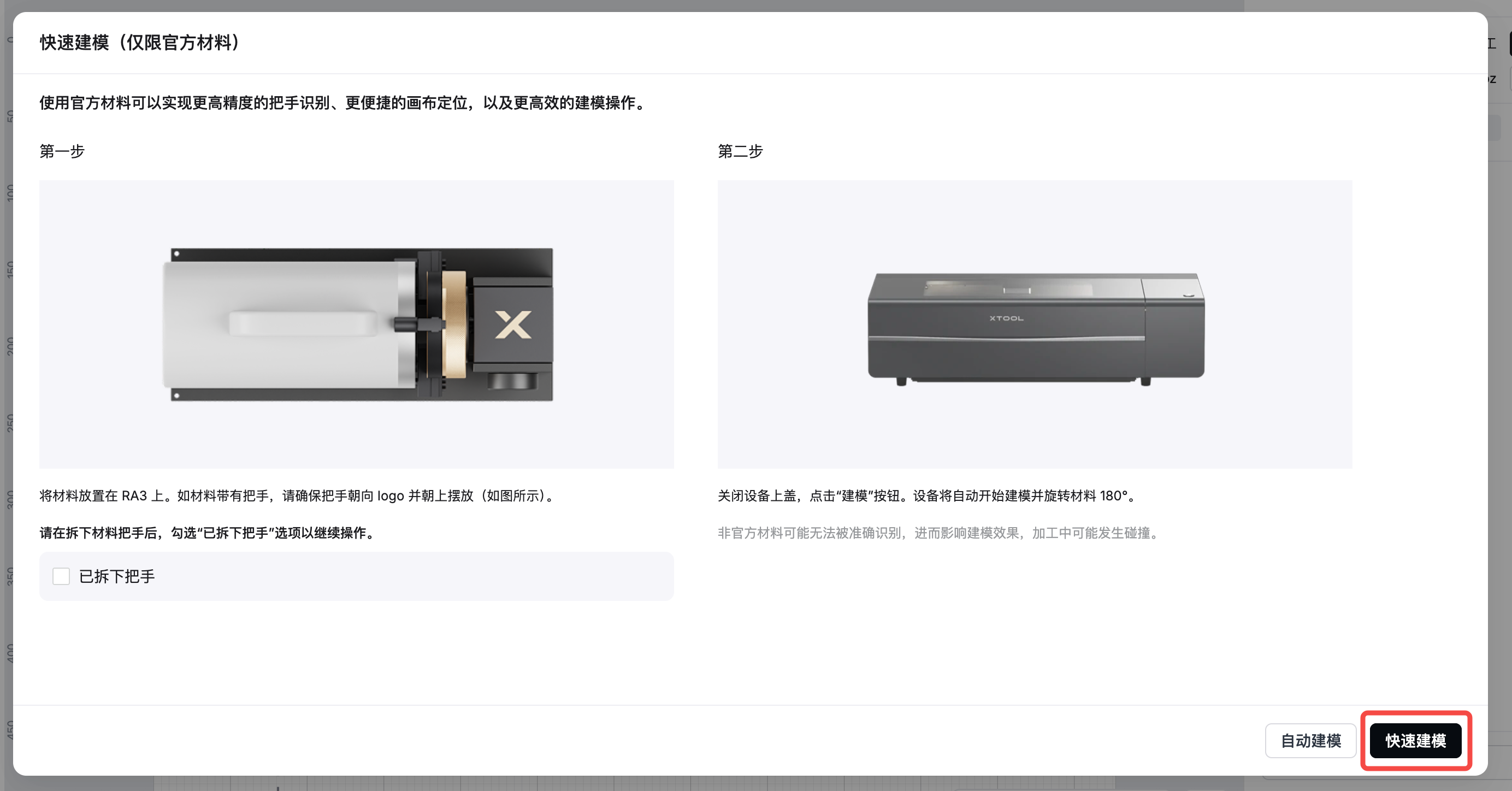 3. 按照弹窗显示,放置材料,确认手柄方向正确后,点击“快速建模”。