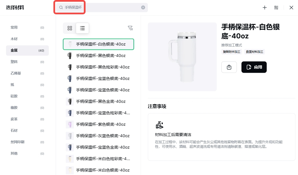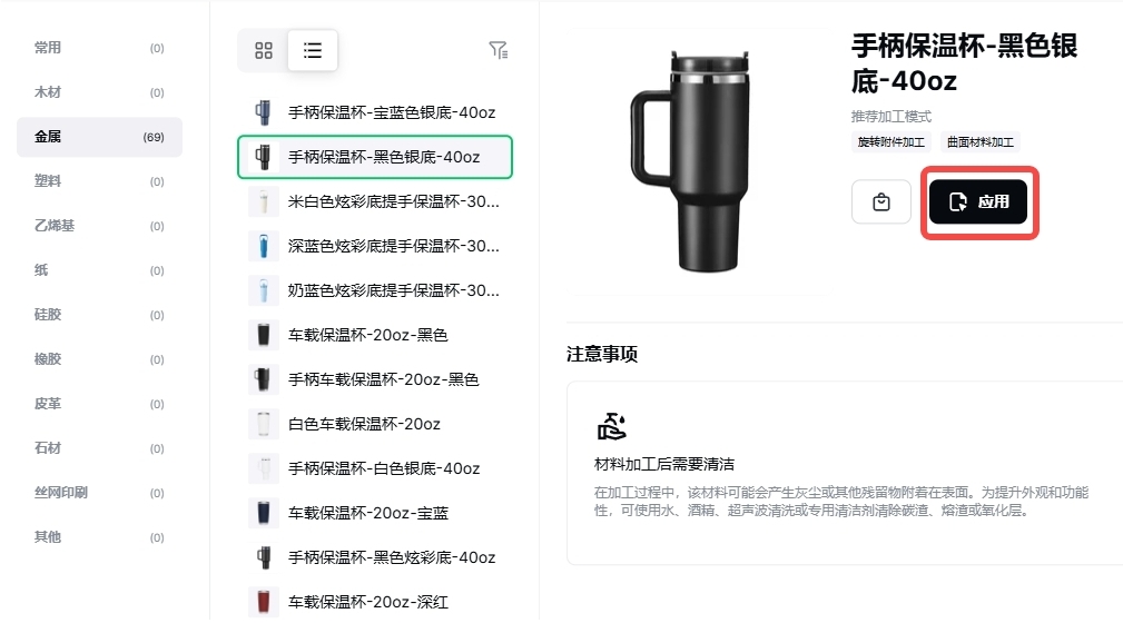 4. 在“金属”页签下选择保温杯款式,点击“应用”。