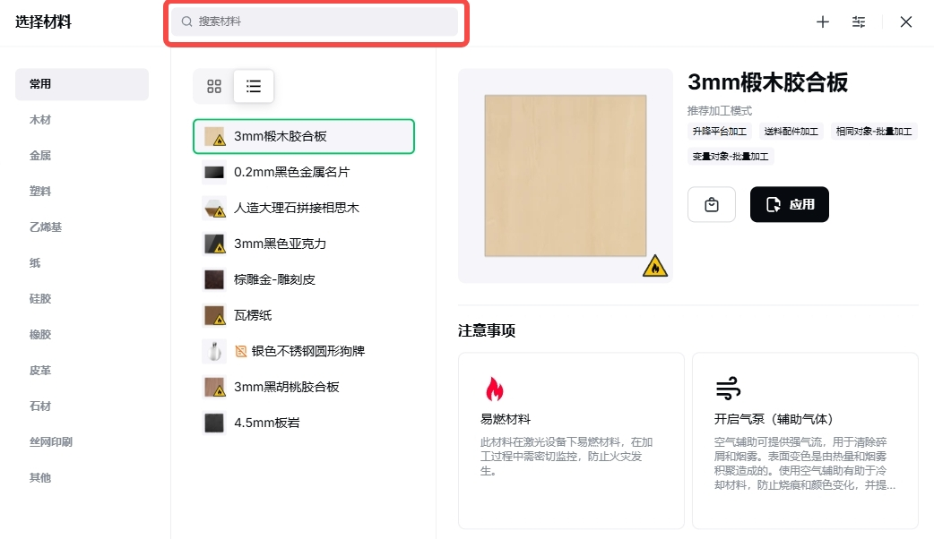 2. 点击“选择材料”页面的“搜索材料”。