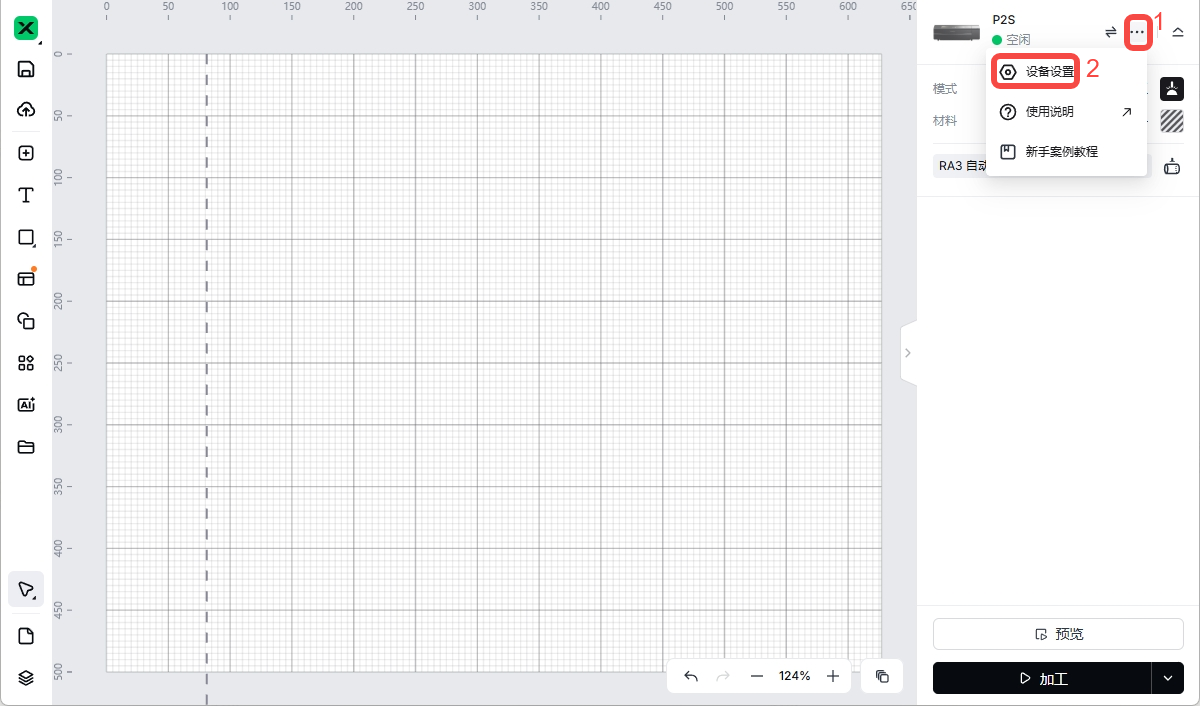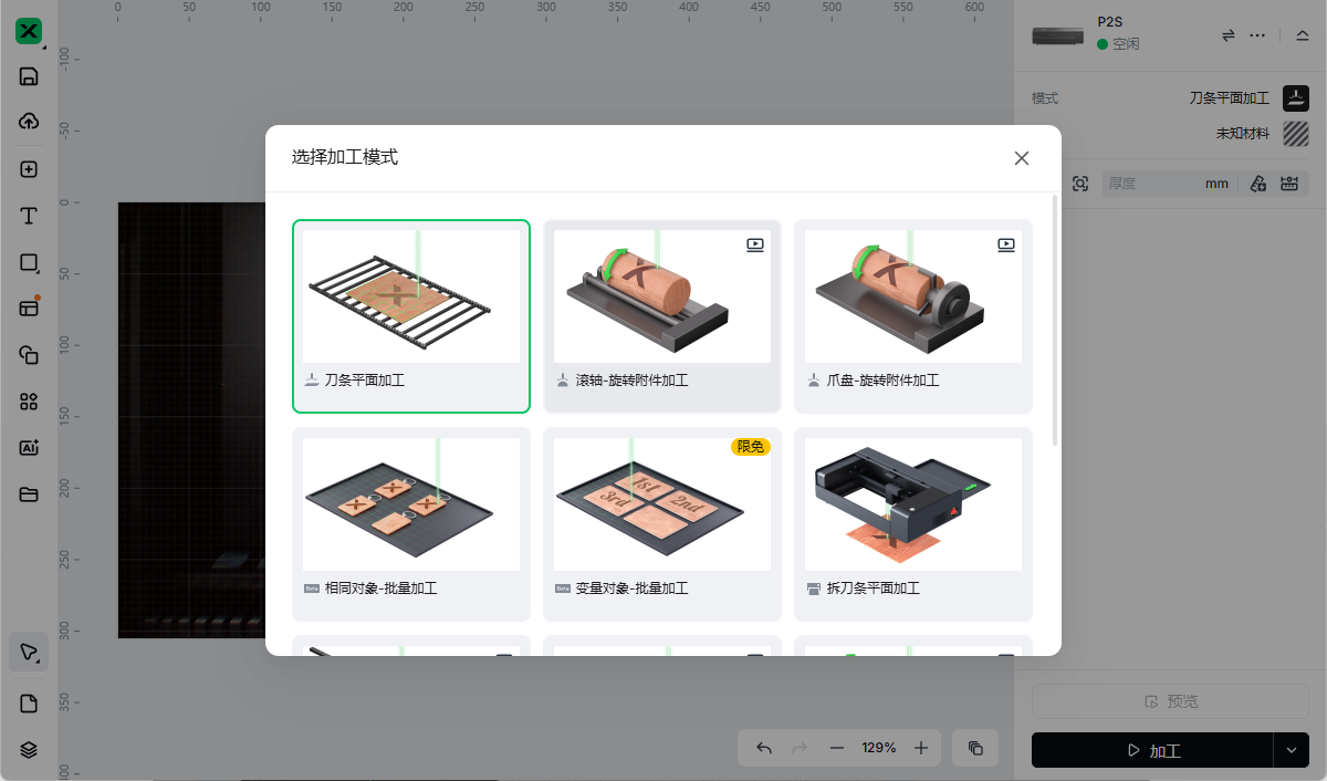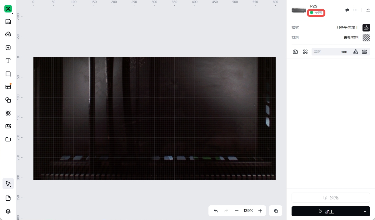 💡 点击“加工”后,在“加工前确认”弹窗中点击“开始”。若功率值过低(例如 1%),点击“加工”可能会出现提示。将功率调高后,该提示将不再出现。
