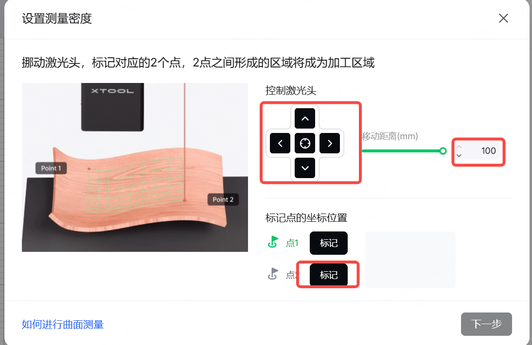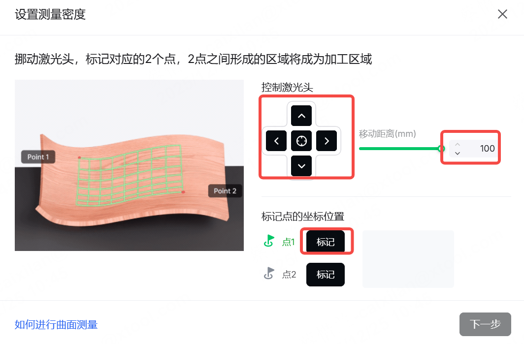 (1)通过点击方向按钮移动激光器,使机器投射下来的红光打在待测量区域的左上顶点,然后点击“标记”将其标记为点1。