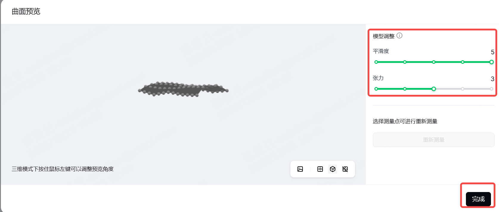 测量完成后xTool Studio 软件生成模型。你可以按住鼠标左键调整预览角度,还可以通过设置平滑度和张力调整模型。