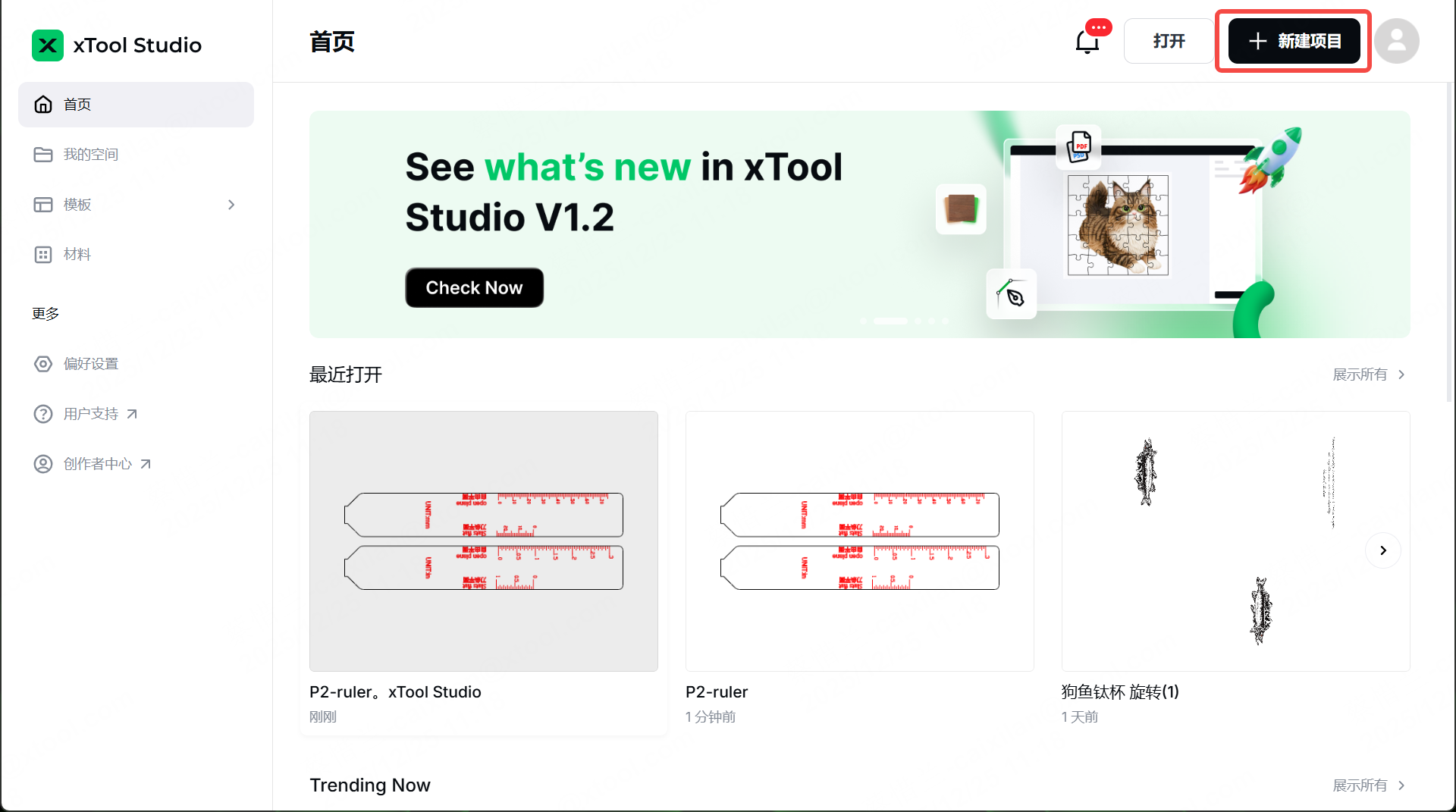 - 在xTool Studio首页右上角,点击 “+ 新建项目”按钮,创建一个新项目。