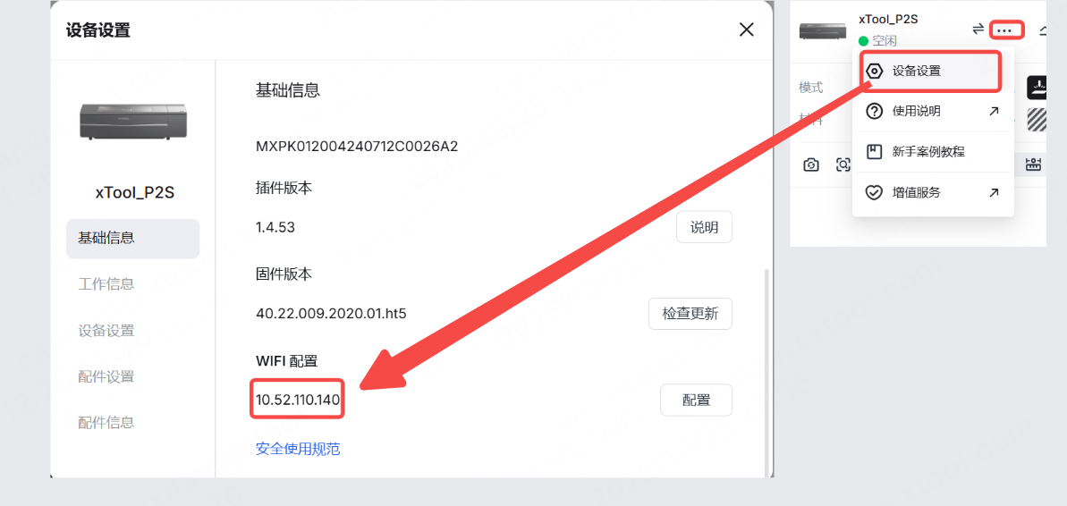 - 通过 USB 数据线连接xTool Studio 并配置 Wi-Fi 连接后,查看设备信息,获取设备的 IP 地址。