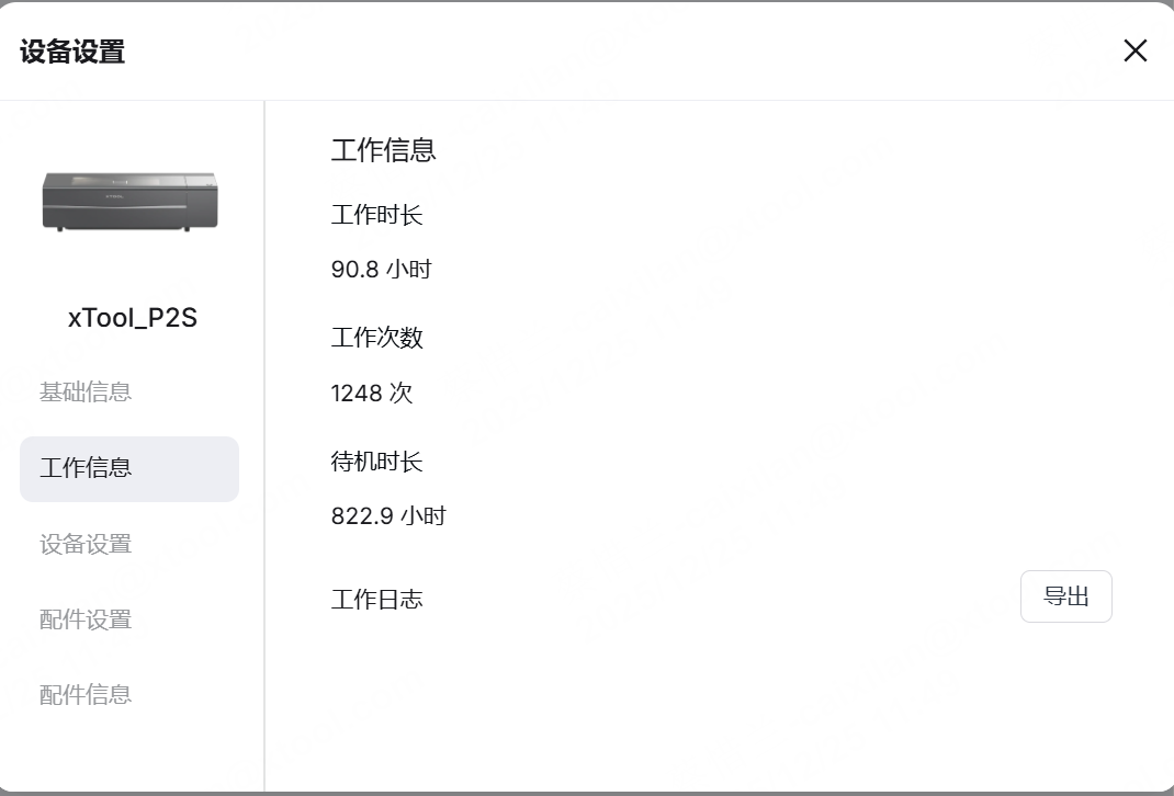 - 工作日志: 可点击“导出”导出设备的工作日志