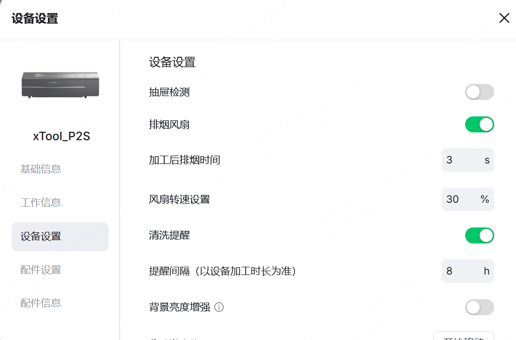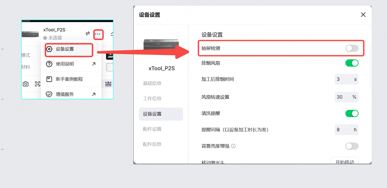 注意: xTool P2 的抽屉检测功能默认是打开的。若你使用的是 4 类激光机器,不关闭此功能的情况下,使用”拆底板加工“模式时, xTool Studio 会一直提示需拆除底板。若你使用的是 1 类激光机器,则无需关闭此功能。