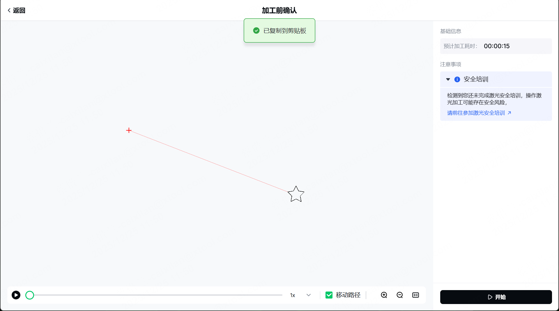 - 最低出光功率: 设置机器的最低出光功率以确保激光器能够出光。理论上,激光器正常出光时, 出光功率与输入功率相同,但随着机器的不断使用,出光功率会略低于输入功率。机器正常工作时可以不设置此参数。