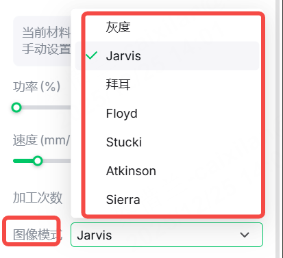 xTool Studio 提供了多种图像模式,包括灰度、拜耳、Floyd、Stucki、Atkinson、Jarvis 以及 Sierra,其中灰度为默认模式。