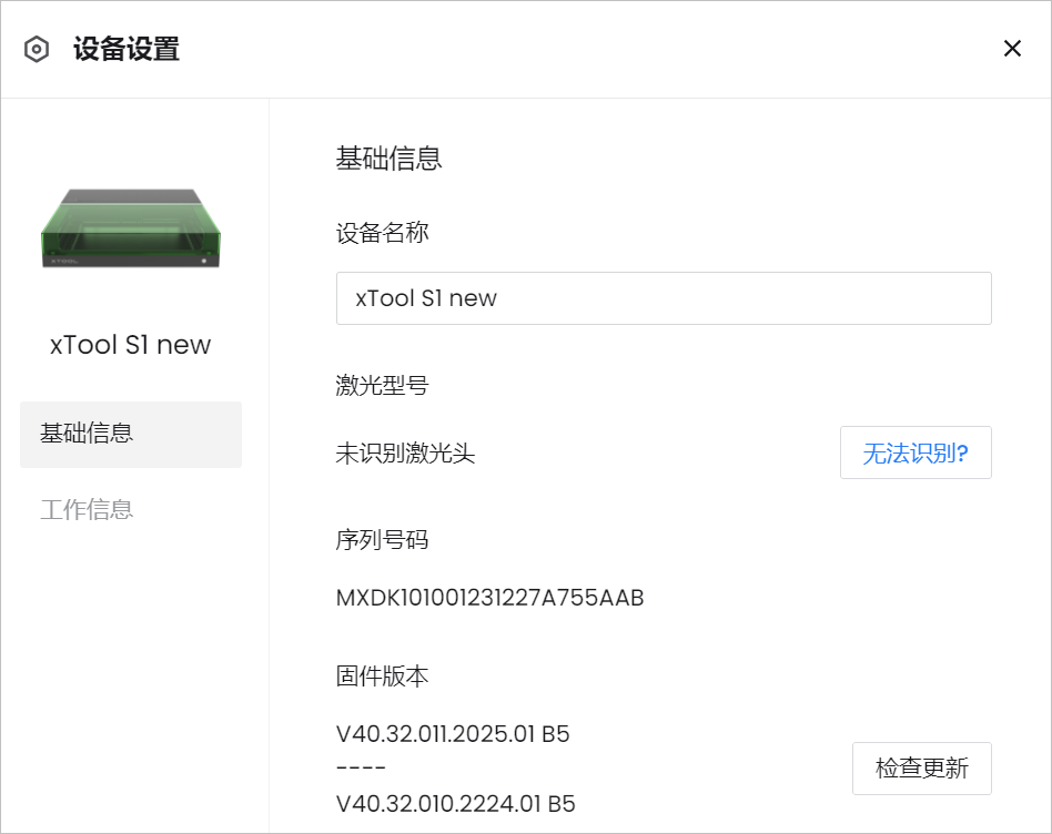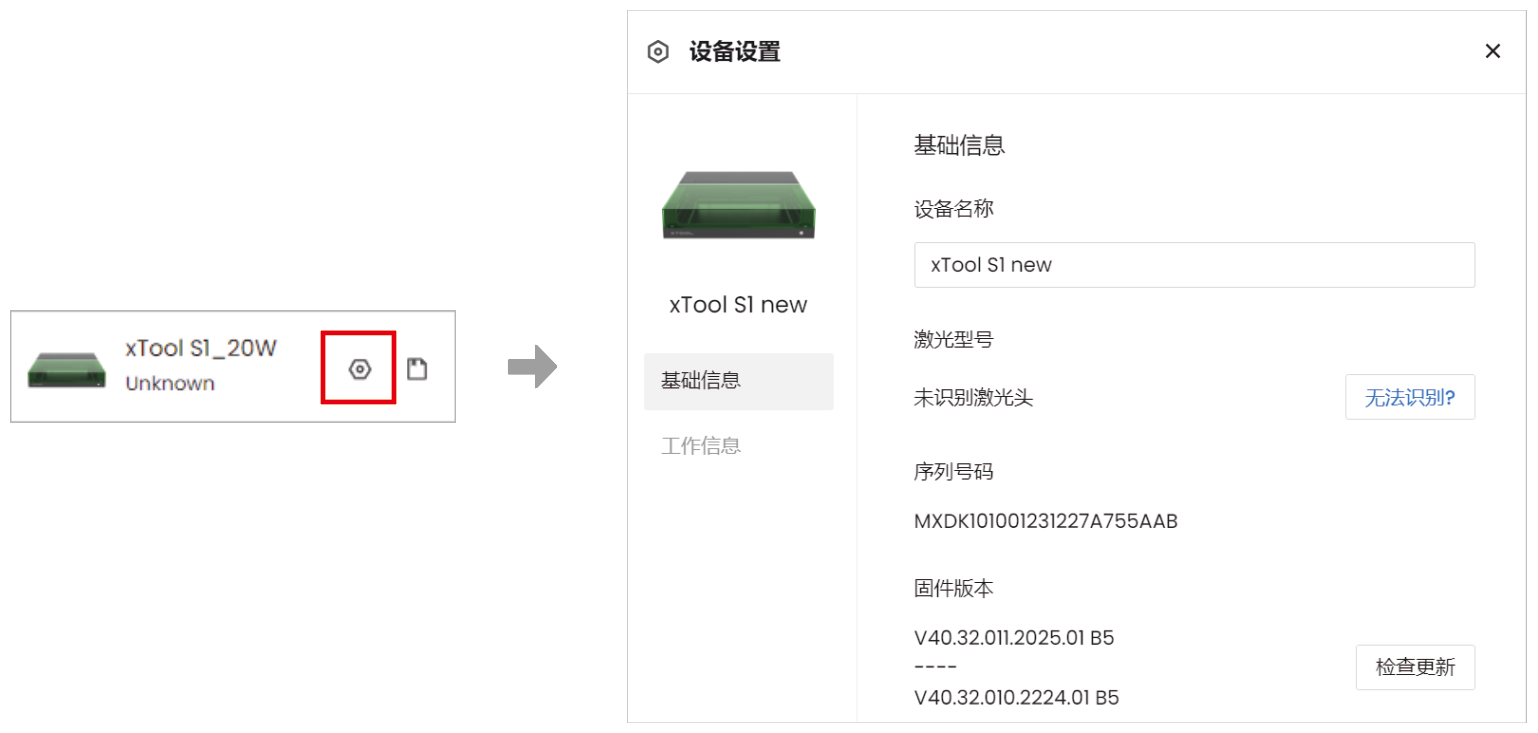 (1)在 XCS 界面右上角,点击 xTool S1 图片旁边的齿轮图标,打开设置窗口。