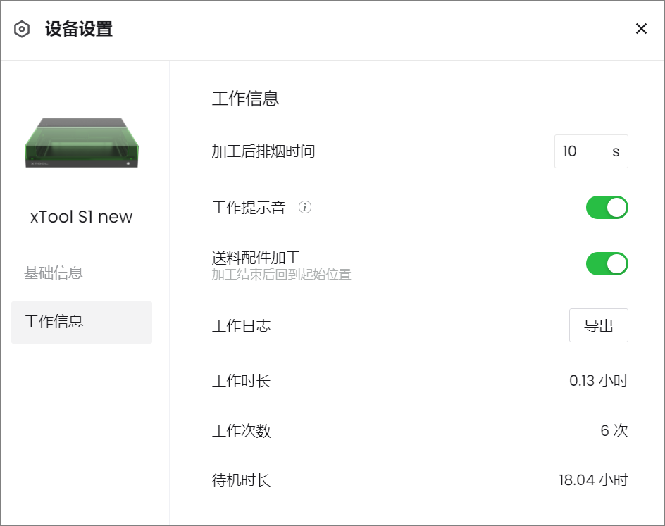 (3)在“工作信息”中,你可以对设备进行加工相关的设置,并查看或导出设备工作信息。