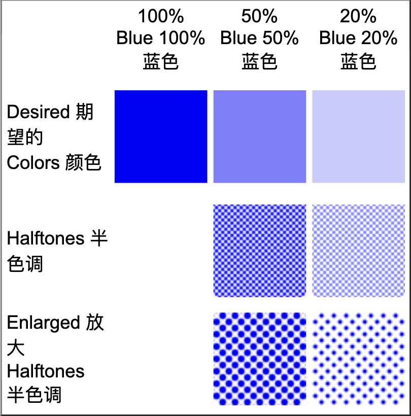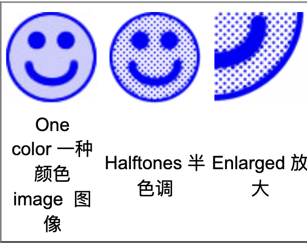 半色调指的是一种印刷技术,视觉上,它通过使用不同大小,密度小点的排列(AM screening 对应使用点的大小的变化来表达,FM screening 对应使用点的密度 频率来表达,PS中采用的方法为AM screening),来表示连续较暗或较亮的颜色值。从而通过单一或者有限颜色的油墨,来产生使用了多种不同颜色油墨来制作图像的错觉。