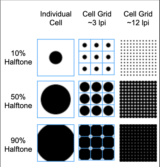 在丝网印刷中,微观来看,丝网上一个格子中感光胶只能被雕刻穿透,气化,或者完全遮蔽。因此油墨只能选择通过或者不通过丝网。对于一些想要通过有限的颜色油墨以及有限的网版内,创造出尽可能丰富的效果的使用者来说,半调网屏是一项非常有利的雕刻图像预处理工具。