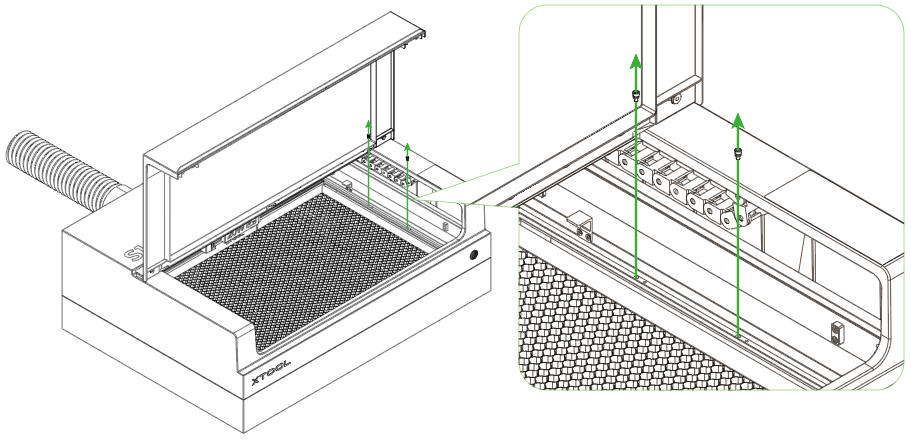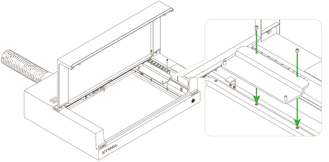 注意:xTool S1 安装了扩展底座后,网框固定件在扩展底座上的安装位置与在底板上的安装位置有所不同,因此 XCS 画布上标记的加工区域与网版位置会有偏差,加工前请先走边框确认实际加工区域。