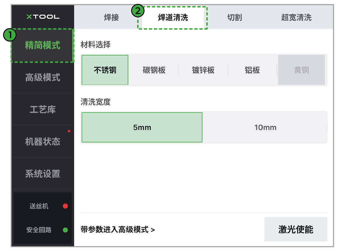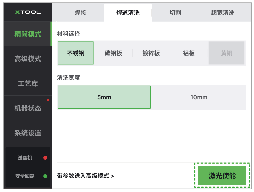 (2)在触控屏上,选择“精简模式”>“焊道清洗”。根据实际情况,选择好材料类型、清洗宽度。