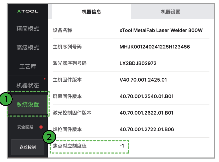 在触控屏上,点击“系统设置”,查看并记下“焦点刻度对应值”。