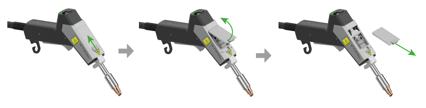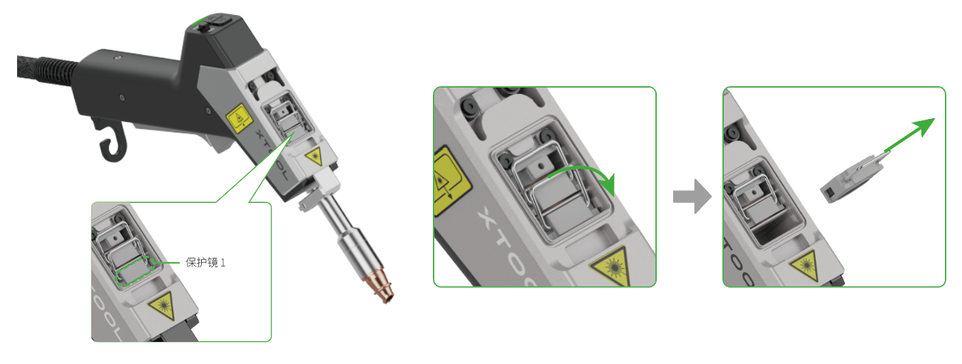 注意:取出保护镜后,建议将焊枪盖子装回,以免灰尘落入焊枪内部,造成焊枪损坏。