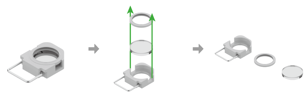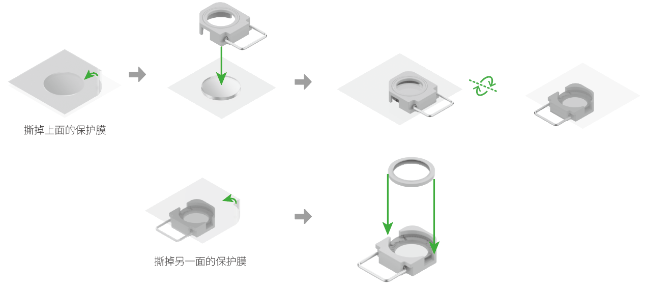 注意: 更换过程中,避免手指或其他工具接触镜片,以免镜片脏污。若不小心弄脏镜片或镜片落灰,请使用棉签进行清洁。