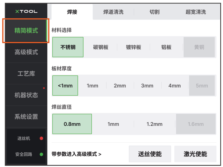 在此模式下,您只需选择加工模式和材料属性(焊接时还需选择焊丝属性)。根据您的选择,机器将应用默认的参数设置进行加工。