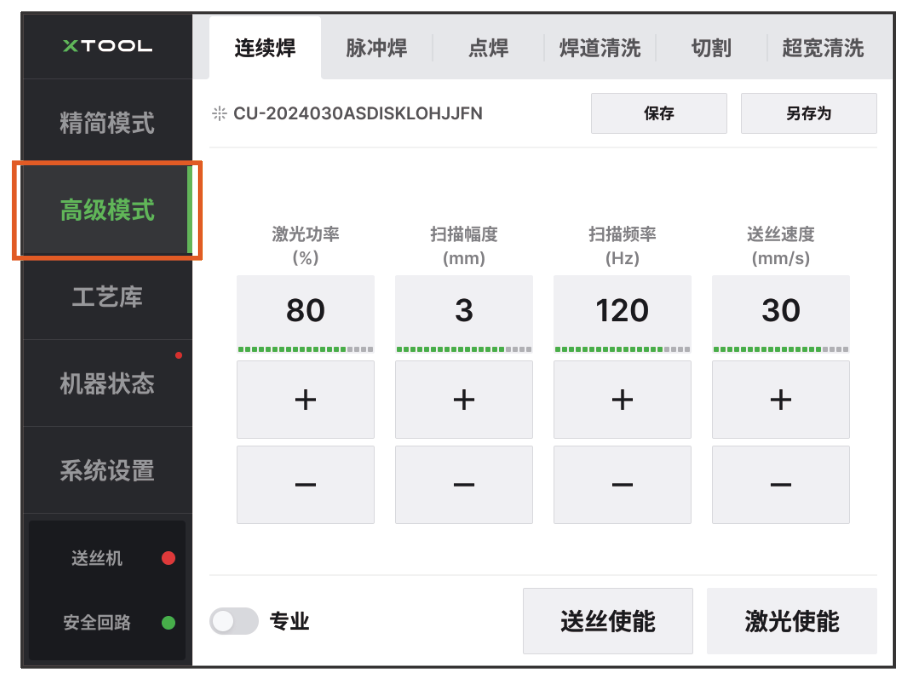 在此模式下,您可以使用更多焊接模式,可调整基本加工参数。您还可以将您的设置保存到工艺库以备后续使用。