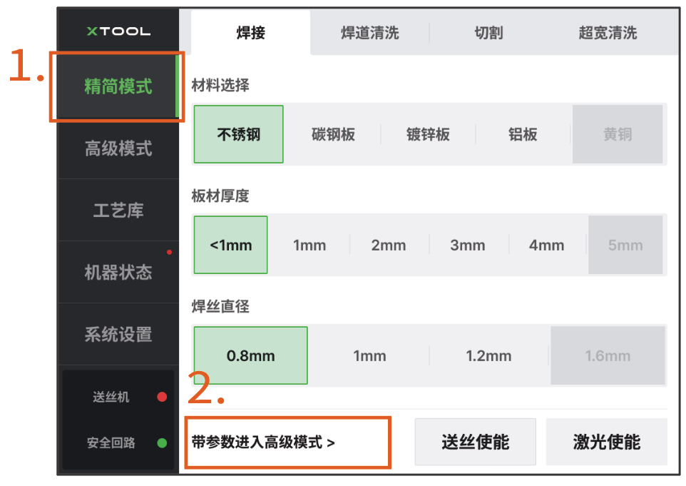 先进入精简模式,选择加工模式、材料属性(焊接还需选择焊丝属性)。然后,在屏幕左下角点击“带参数进入高级模式”。