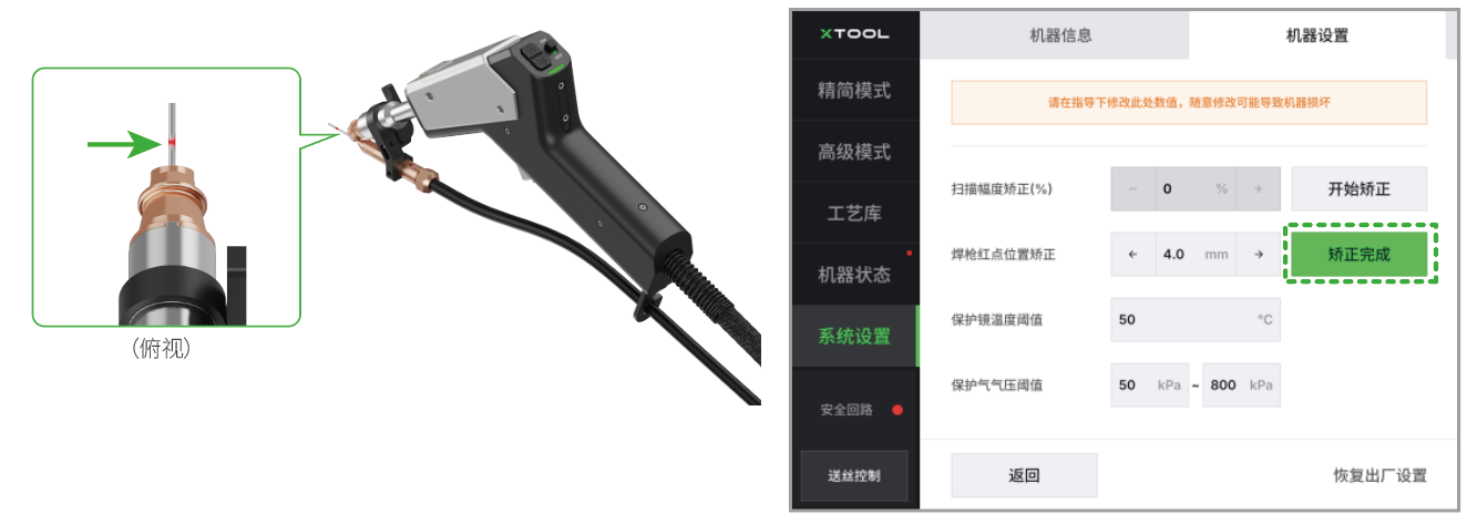 - 当红色光点的中心落在焊丝上时,点击“校正完成”,以保存校正结果。