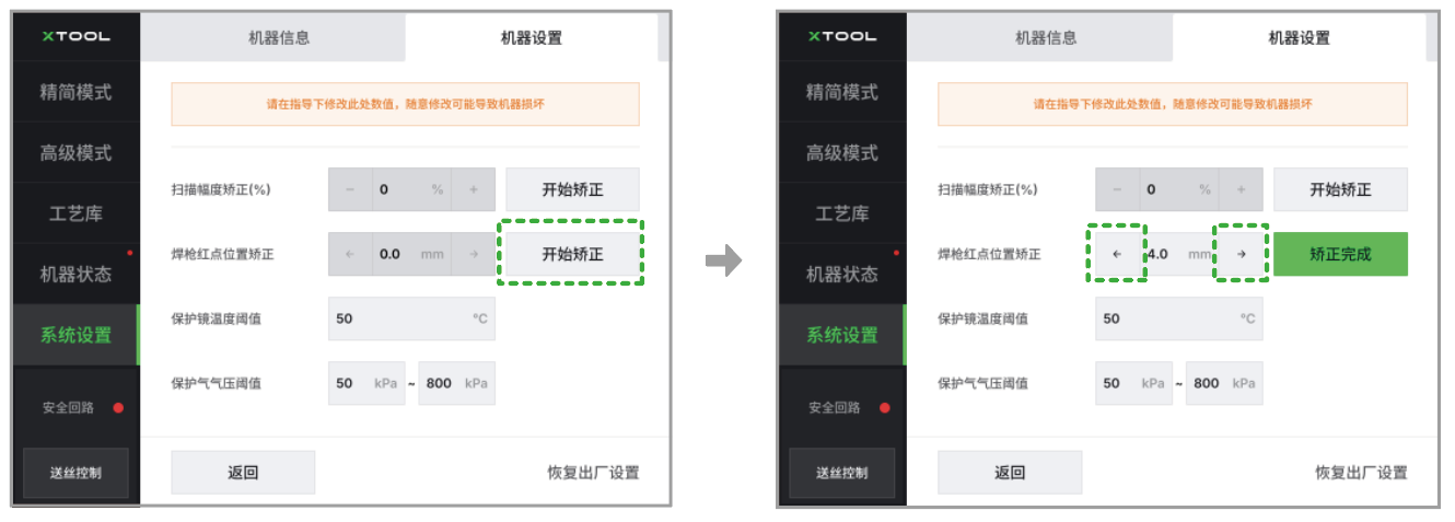 - 在“焊枪红点位置校正”右侧,点击“开始校正”。
