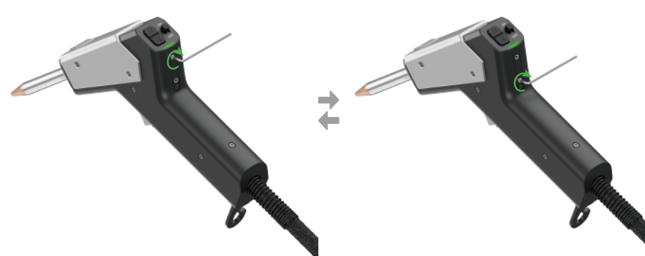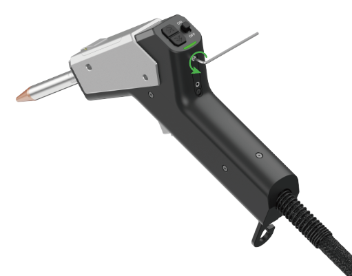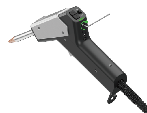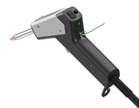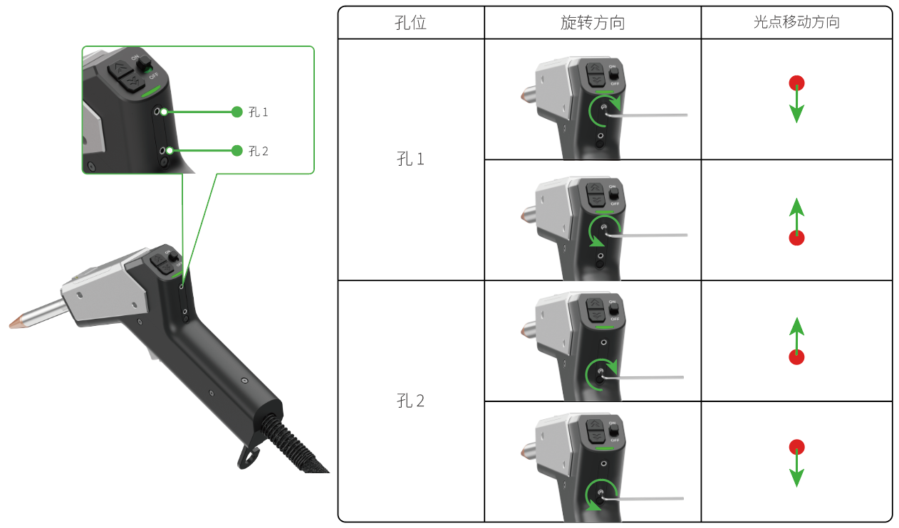通过拧动焊枪背部两个小孔内的螺丝,可以调节光束在竖直方向上的偏转。