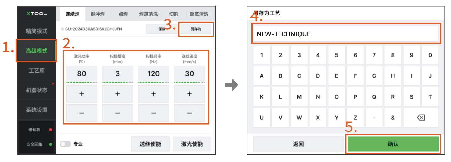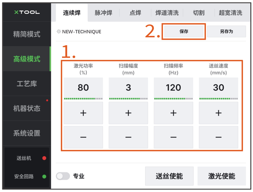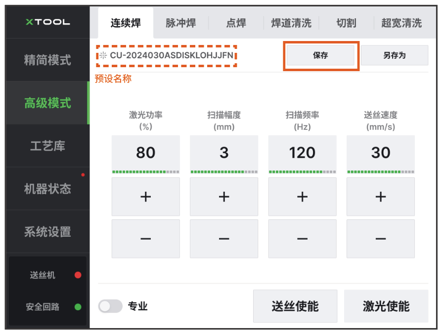 在高级模式(或专业模式)下,为每个参数设置合适的值,然后点击“另存为”> 输入新工艺名称 > 点击“确认”。
