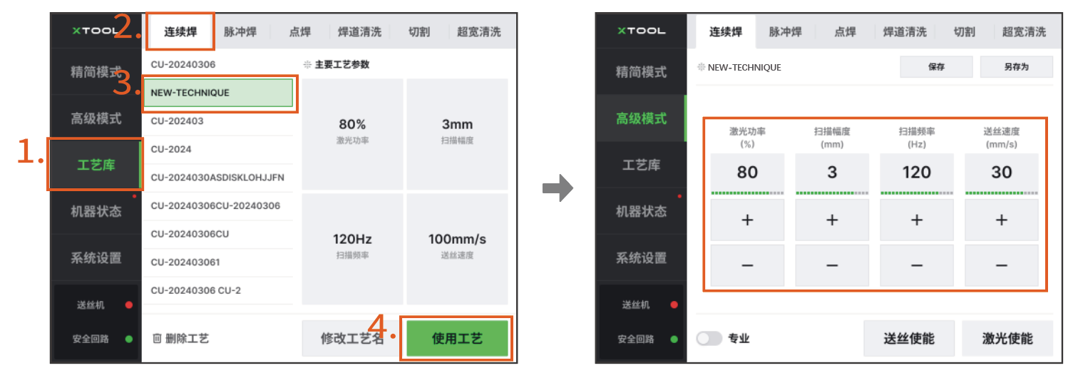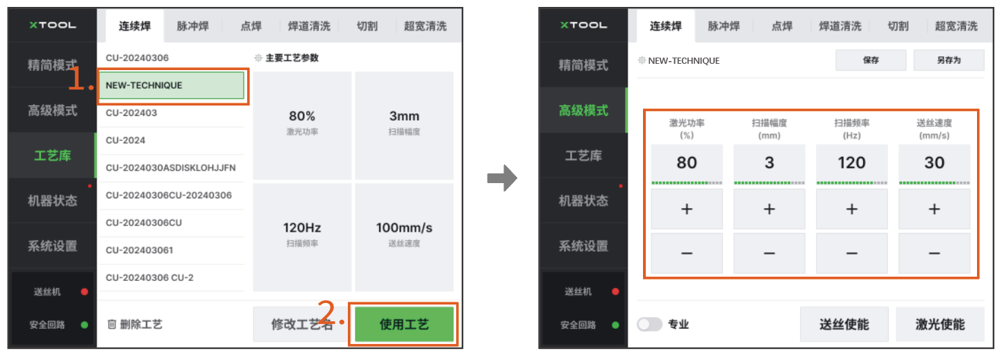 (1) 在工艺库中选择需要修改的工艺,点击“使用工艺”。系统将切换至高级模式并加载该工艺参数设置。