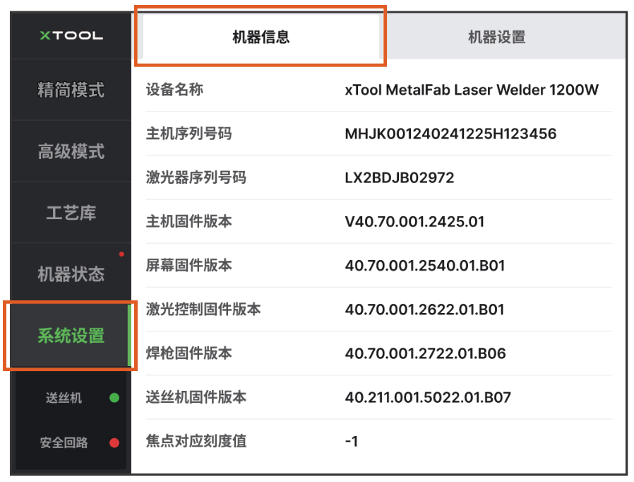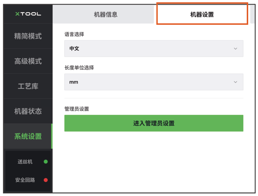 注意: 管理员设置只能在 xTool 技术支持人员的指导下进行修改。未经指导的修改可能会导致机器损坏。
