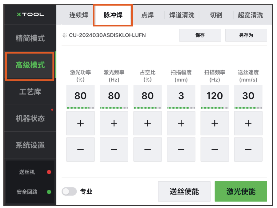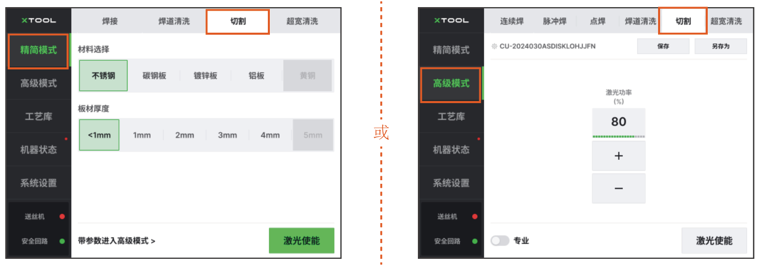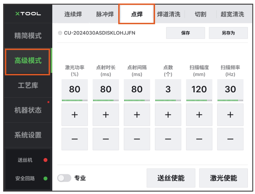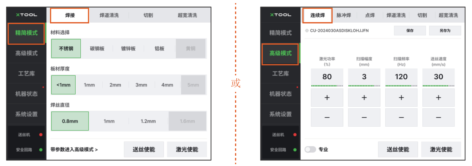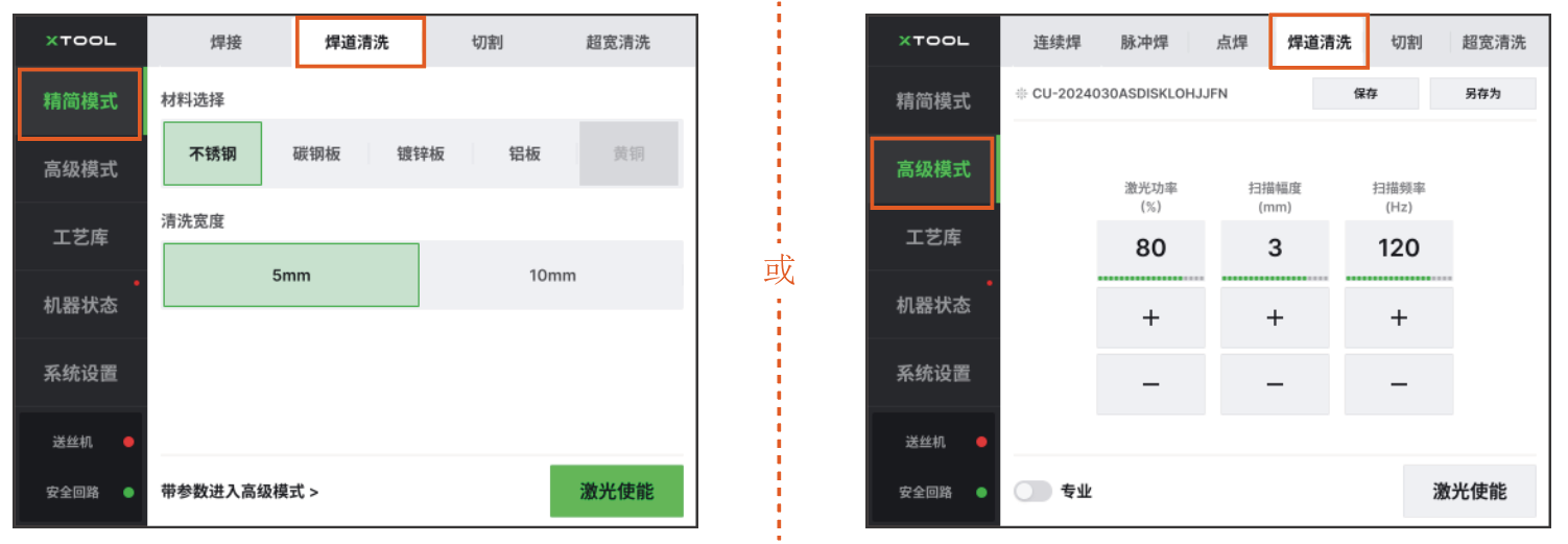 在精简模式下,点击"焊道清洗";或者在高级模式下,选择"焊道清洗"。