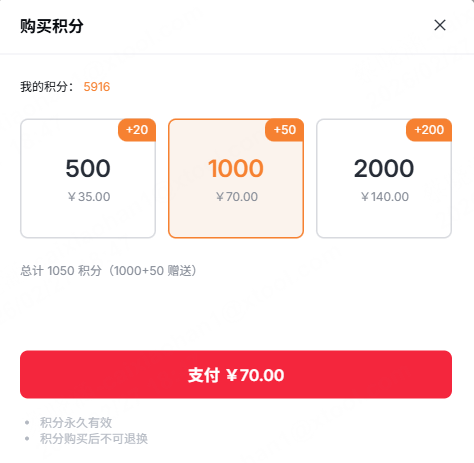 - 在充值页面选择需要的积分档位(具体档位以页面展示为准)。