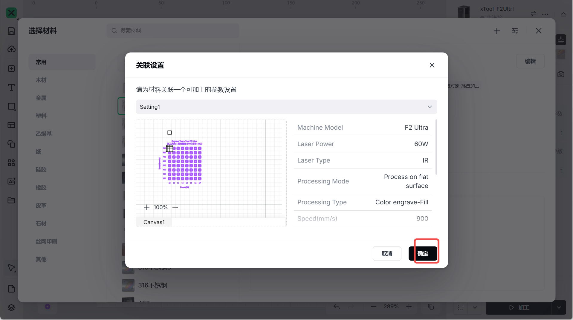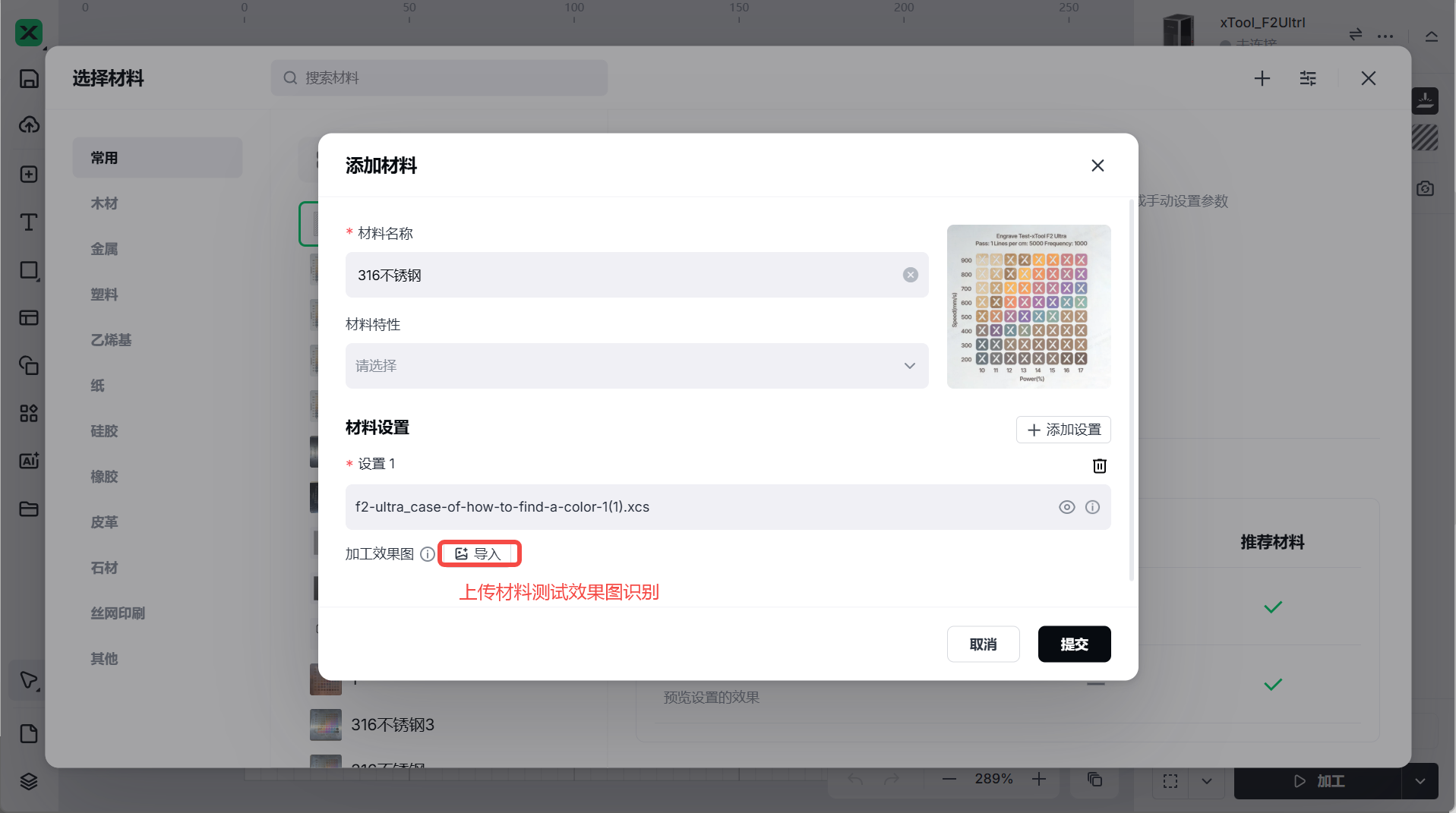 适用范围:将测试好的“参数方案/阵列方案(设置文件)”导入到 xTool Studio中,用于快速在项目中选用预设的雕刻/标刻参数。文档以 F2 Ultra 页面示例为基线,亦适用于其他机型的“自定义材料/参数预设”。