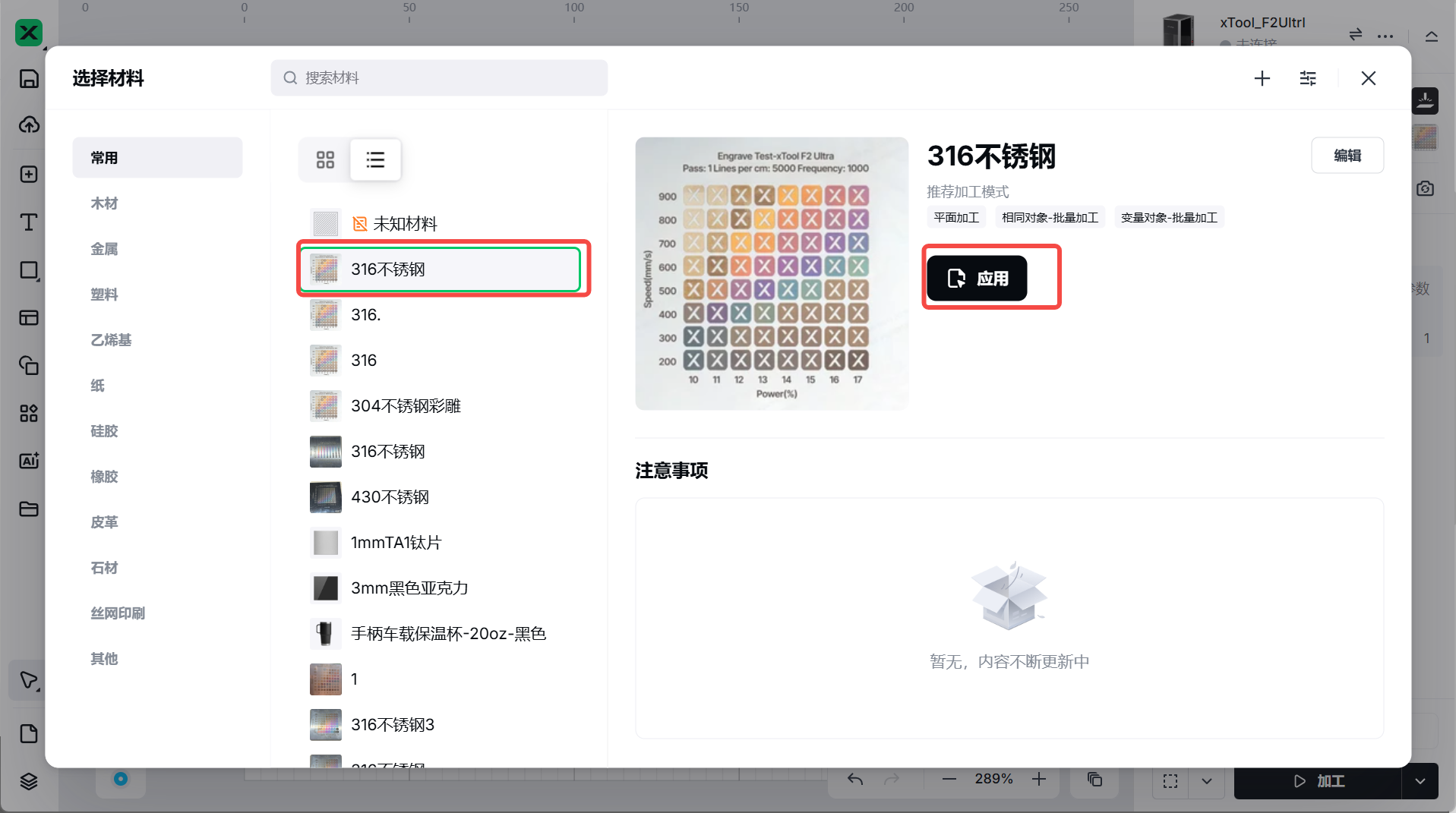 1.打开右上角材料选择导入成功的材料并点进应用