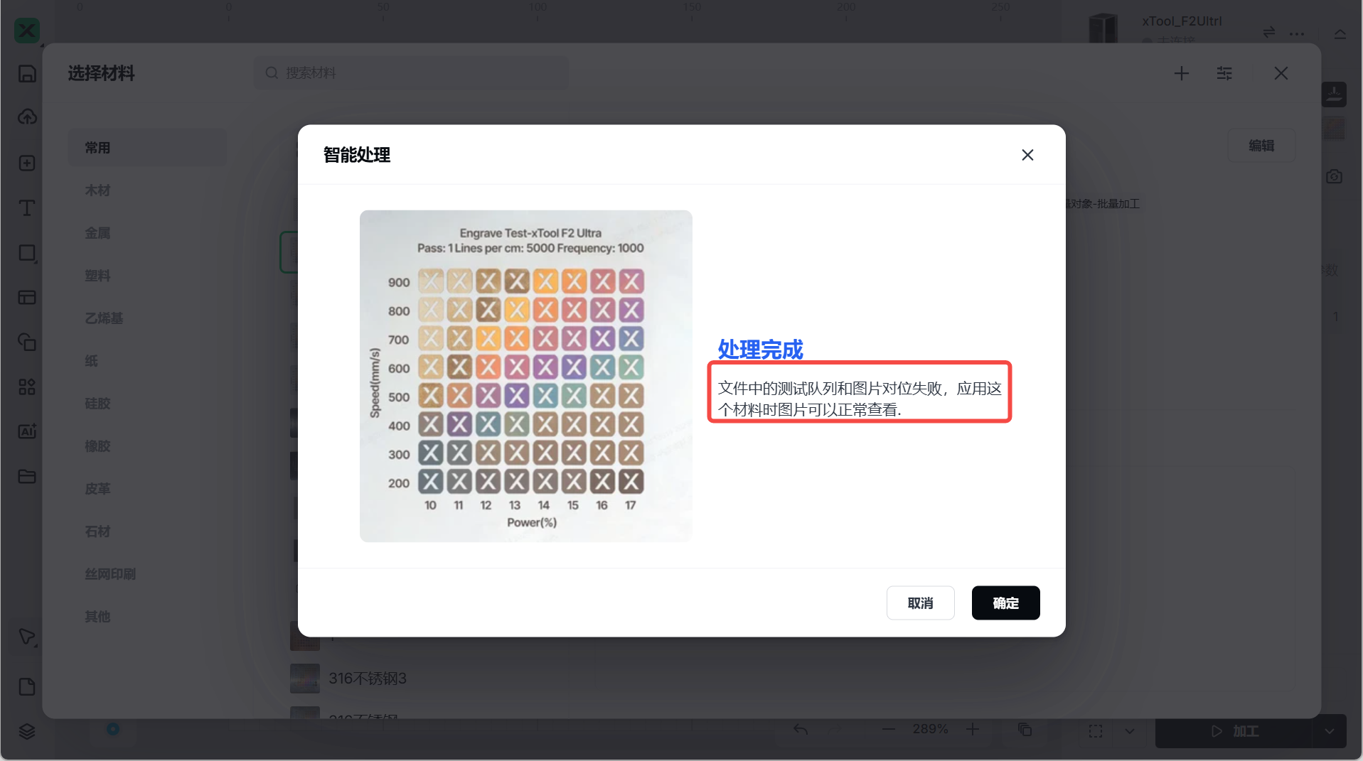 若材料测试效果图像与上传的 xTool Studio 文件不一致,则图像识别后会显示对位失败。