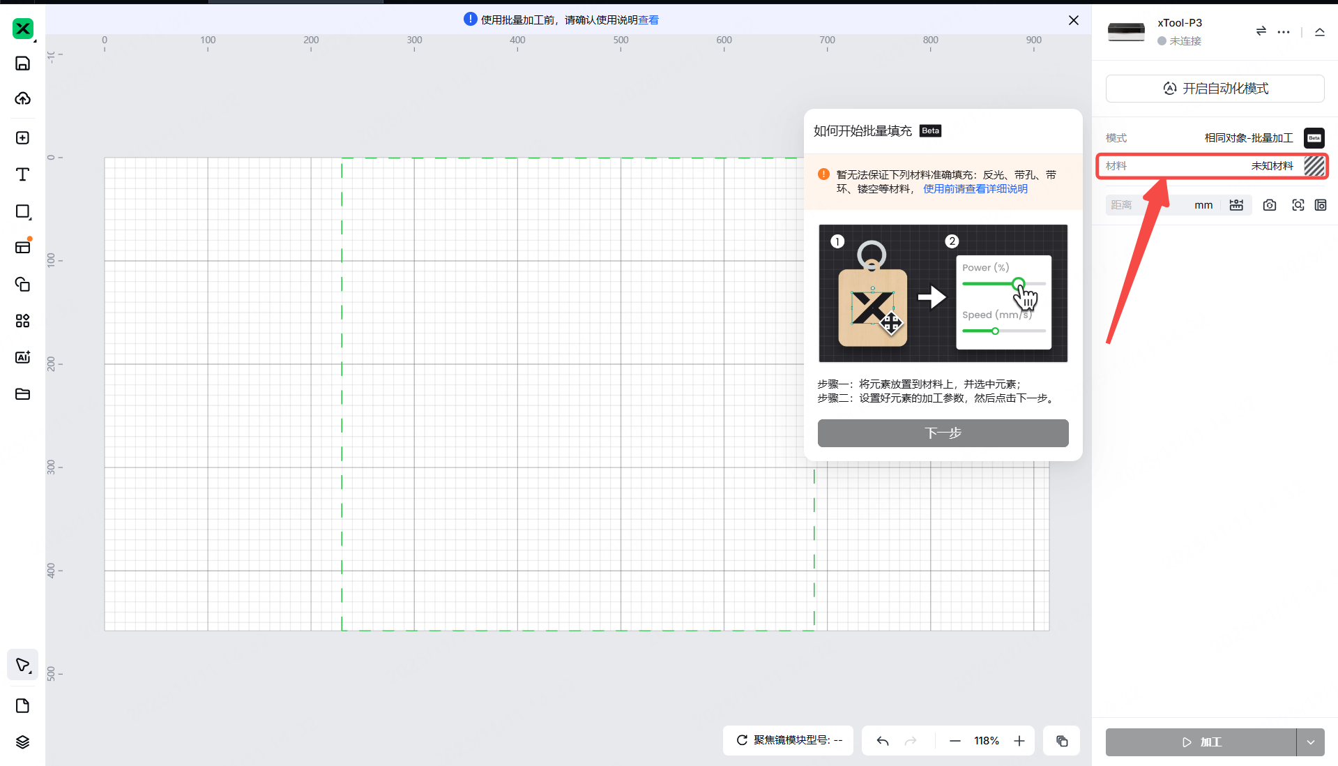请前往“使用 xTool 软件操作 xTool P3”页面,并按照步骤操作。确保设备已成功连接。