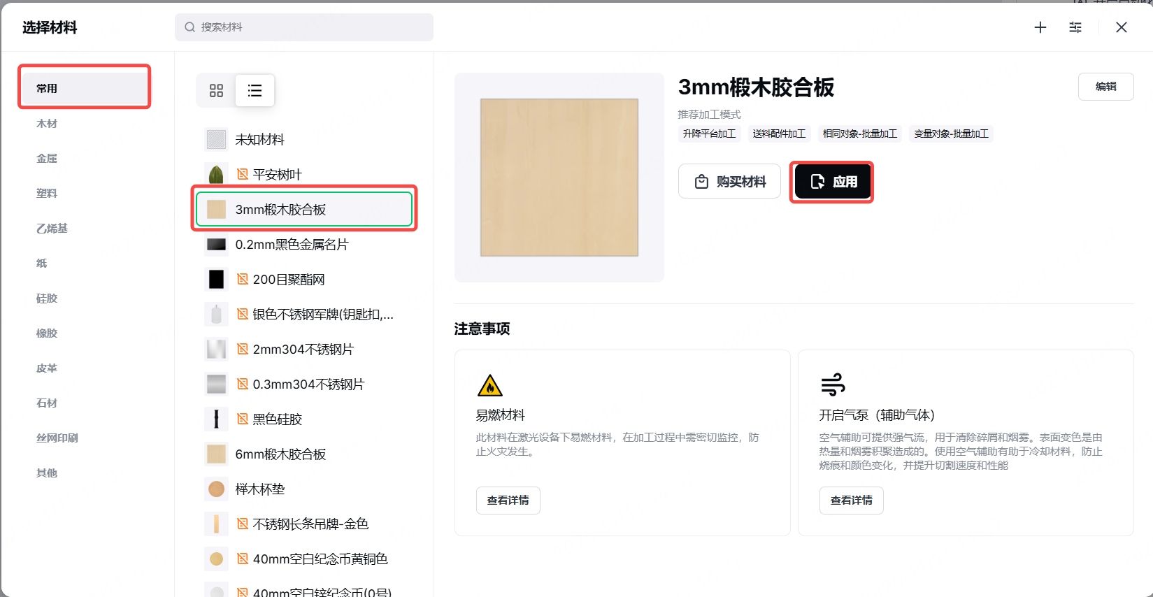 (2)在**“模式”下,选择材料并单击“应用”** 。