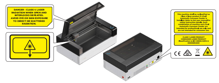 本产品为 1 类激光产品,包含一个 4 类工作激光器和一个 1 类指示激光器。在正常情况下,内嵌激光器被包裹在外壳、遮光罩中工作,使得人体可接触激光不超过 1 类。产品遮光罩及底板配备有安全联锁开关,如工作期间遮光罩盖子或底板被打开,激光器将停止出光。