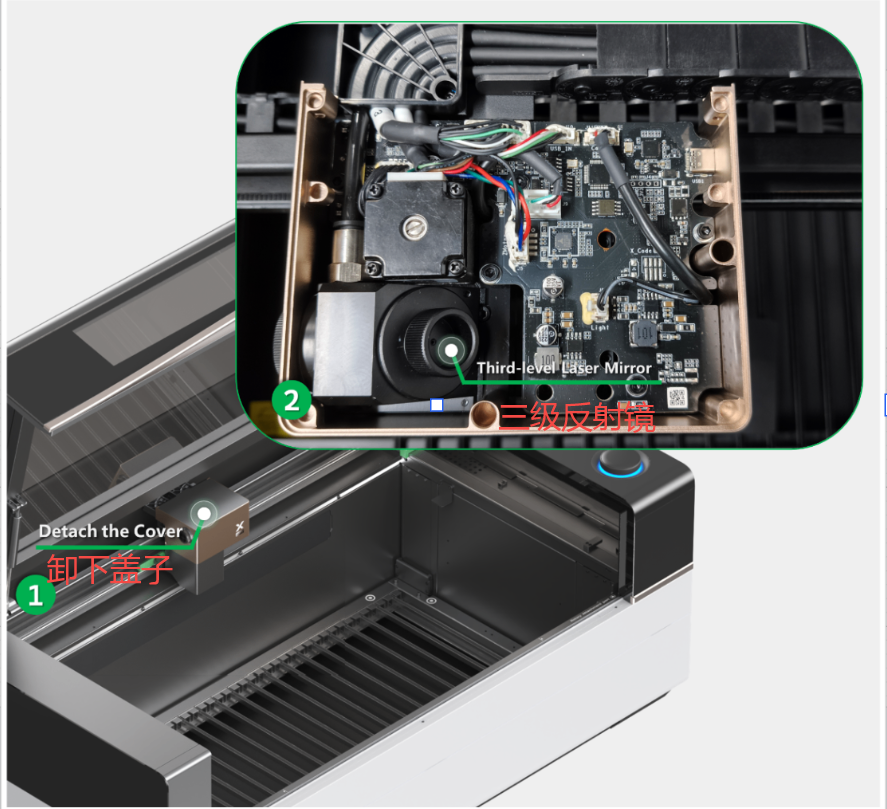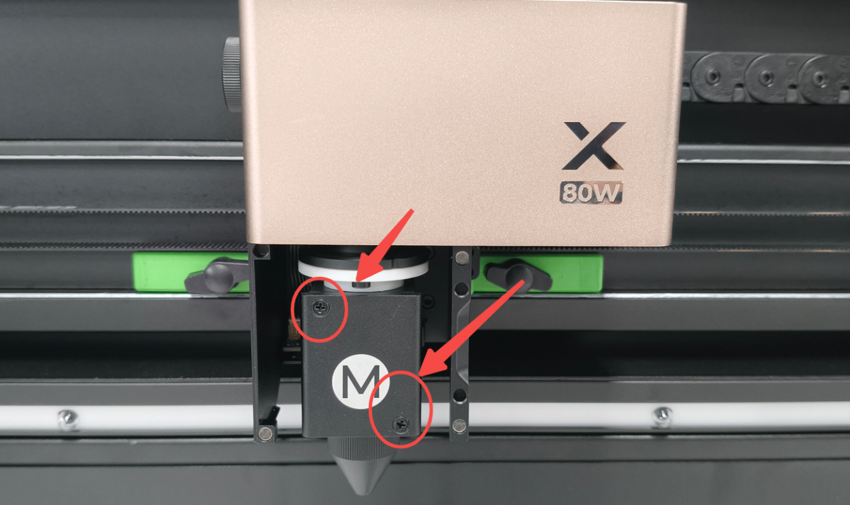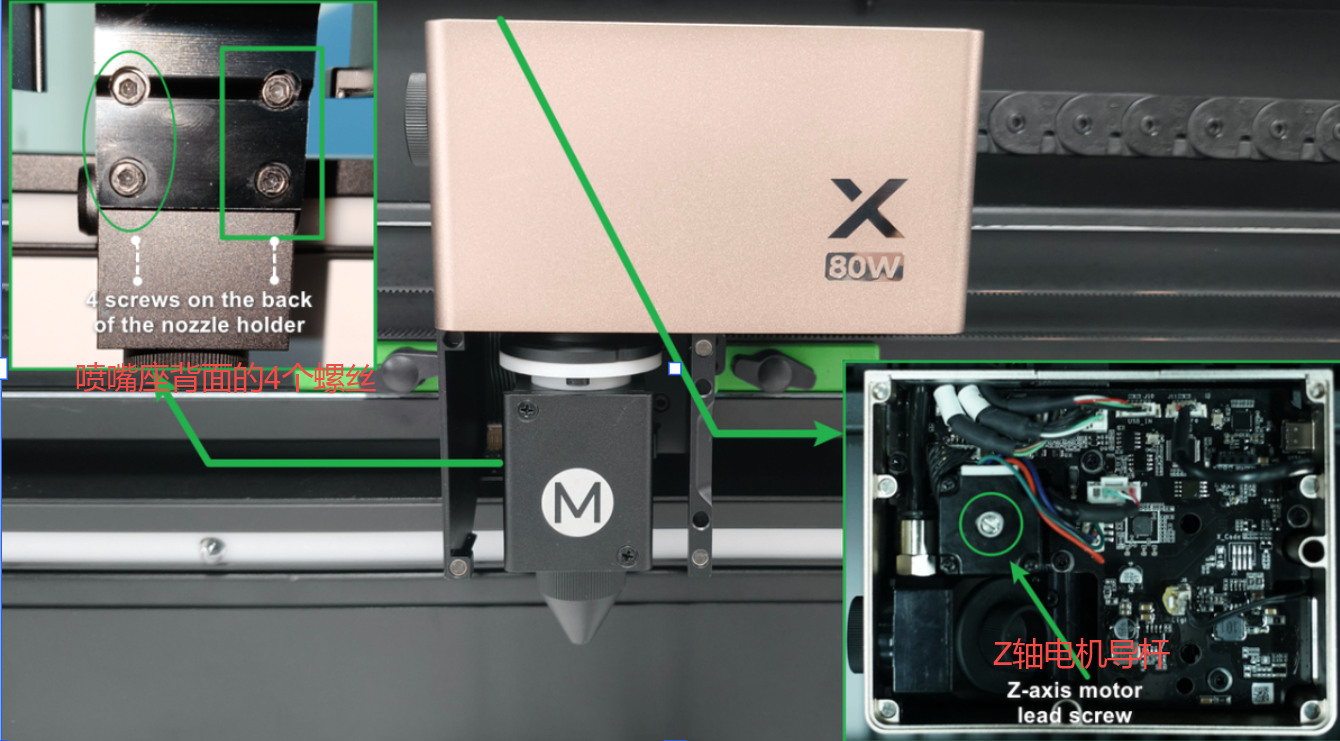 第 1 步: 拆下激光模块的盖子.用螺丝刀拧下 Z 轴电机导杆,将空气喷嘴降低到最低位置。