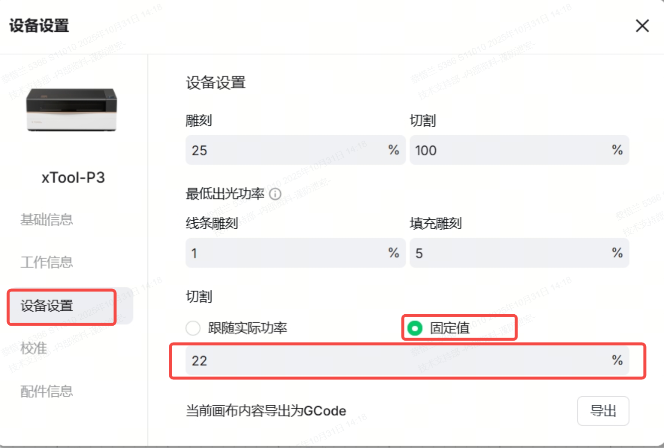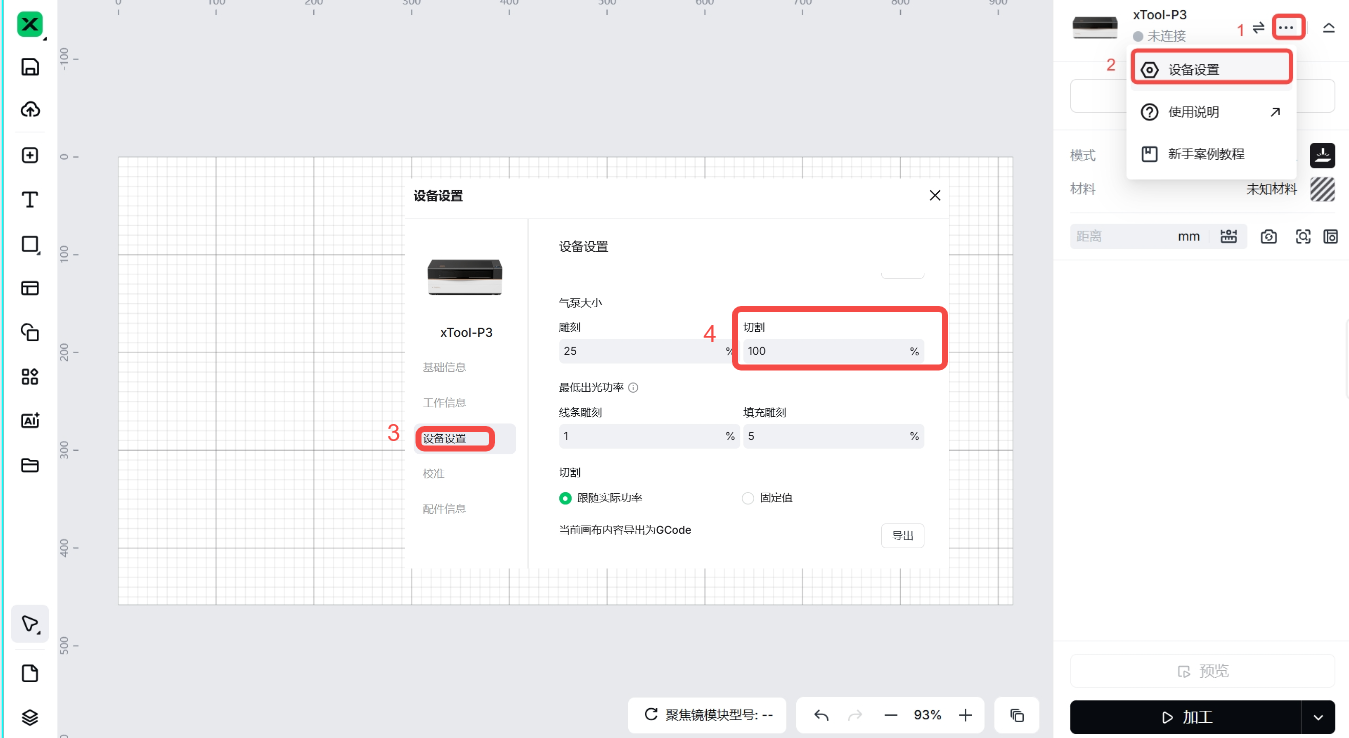 (2)检查切割功率是否为100%(切割功率仅适用于激光切割,而雕刻功率适用于雕刻模式)。