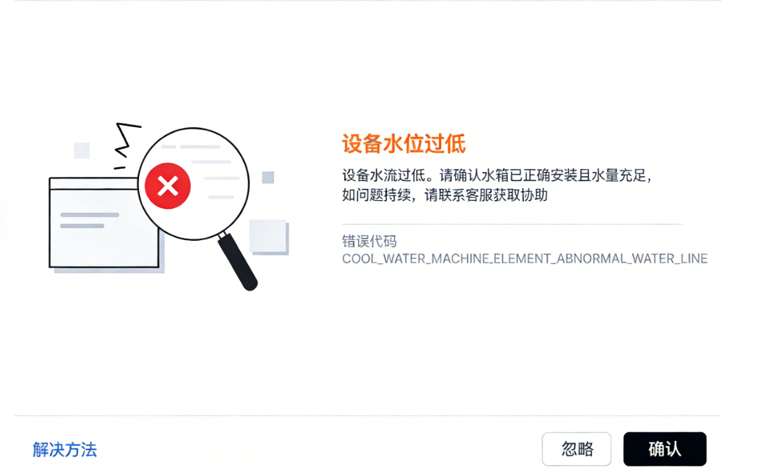 处理过程突然暂停,无法继续。软件弹出一个窗口,错误代码为“COOL_WATER_MACHINE.ELEMENT_ABNORMAL.WATER_LINE_LOW”。