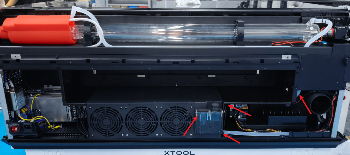 正常情况下,设备开启后,部分防冻液会循环进入激光管和水管,水箱内剩余的防冻液液位约为水箱容量的70%-80%。如果液位明显低于此范围,请添加防冻液至70%-80%的液位。