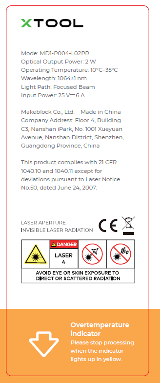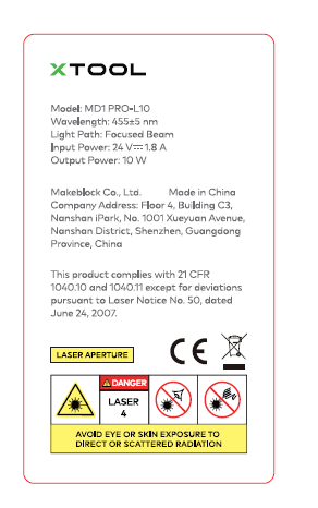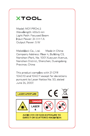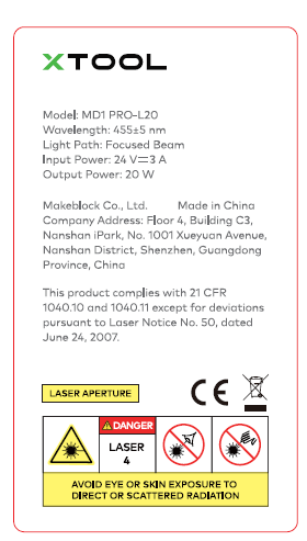 一级激光器在正常作中无法造成伤害。一级 M 激光器相同,除非使用放大光学。xTool D1/D1 Pro 中的红色测量激光器属于一级激光器。