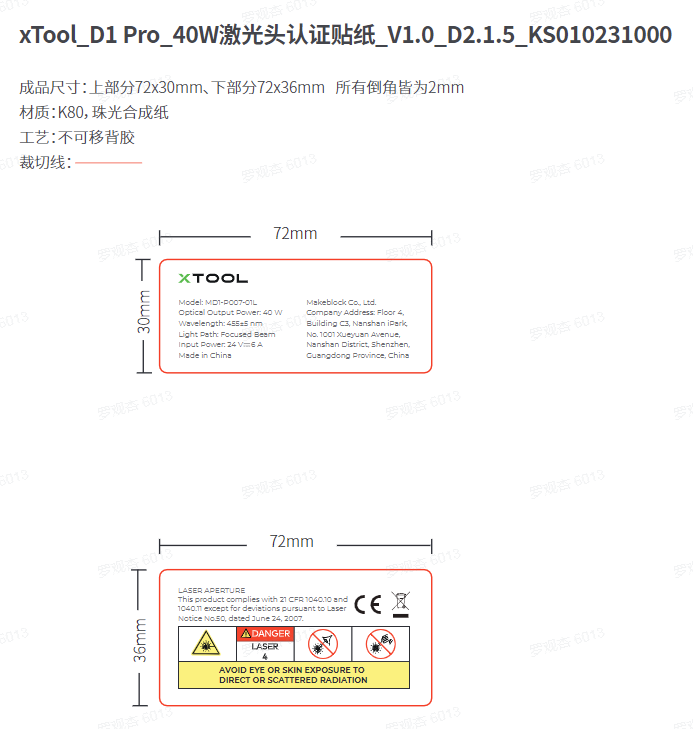 D1/D1 Pro 激光头认证贴纸( 锈色 40W,如下)