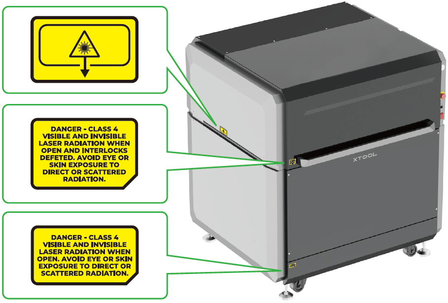 1 类激光器 在正常操作期间不会造成伤害。**1M 类激光器** 相同,除非使用放大光学器件。xTool MetalFab 激光焊接机中的定位激光点是 1 级激光。