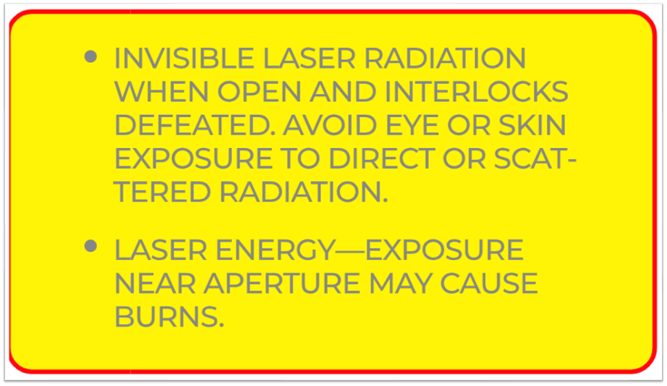 1M 类激光系统 在正常操作期间无法产生危险暴露条件,除非使用光学仪器观察光束。操作 1M 类激光系统的操作员应接受激光安全简报。