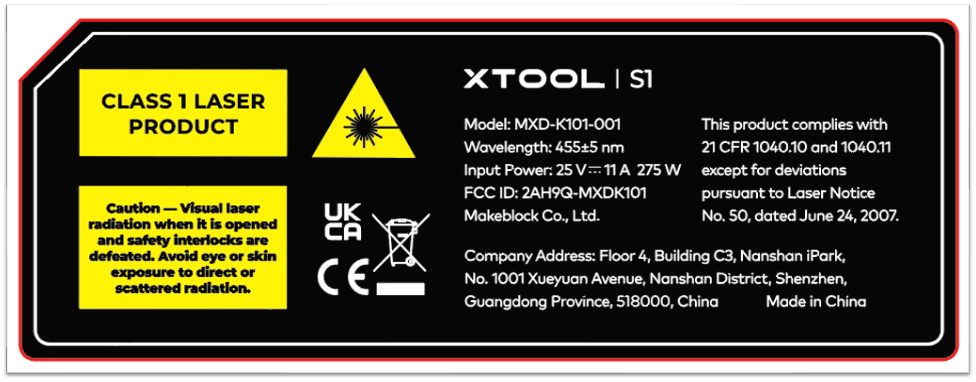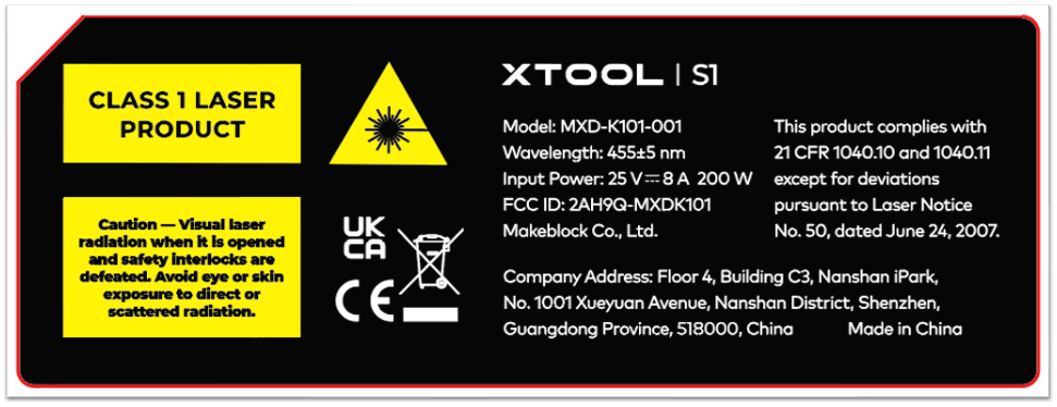 您的 xTool S1 是 1 类激光产品。通常,它在"1 类操作条件"下运行。1 类操作条件意味着这些条件在正常操作期间无法产生破坏性辐射水平。