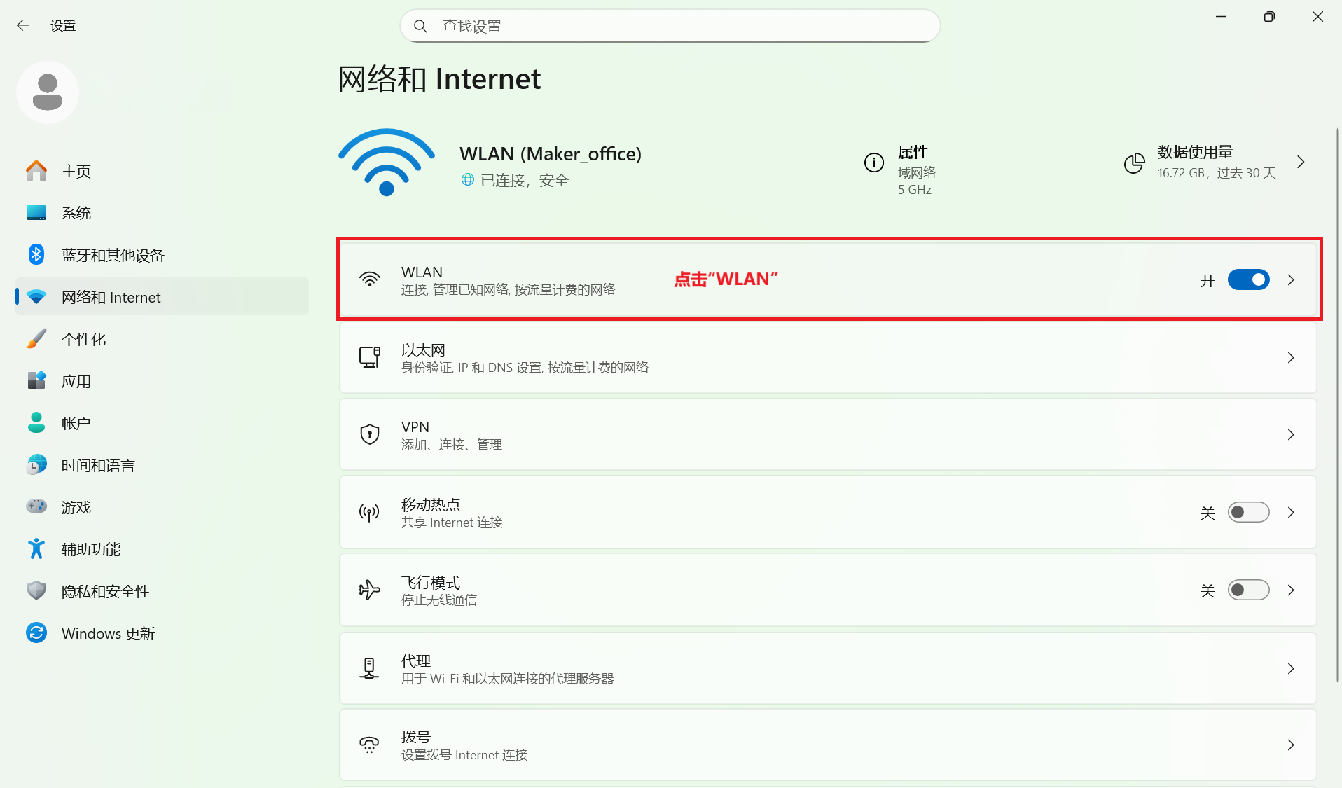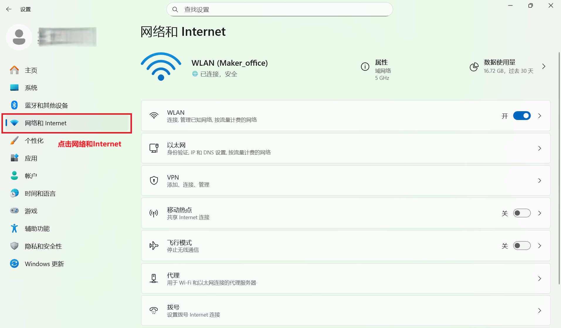 - b. 在左侧面板上,选择“网络和 Internet”。