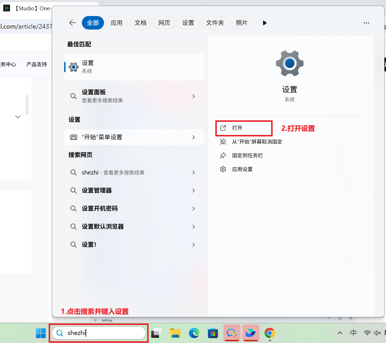 - a. 点击“搜索”图标,输入“设置”;然后点击“打开”。