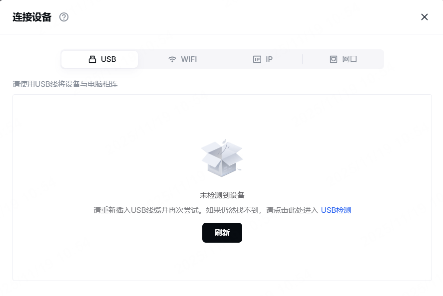 - 如果您在尝试连接后快速收到“找不到通过 USB 连接的设备”消息,请单击“USB检测”按钮进入检测。